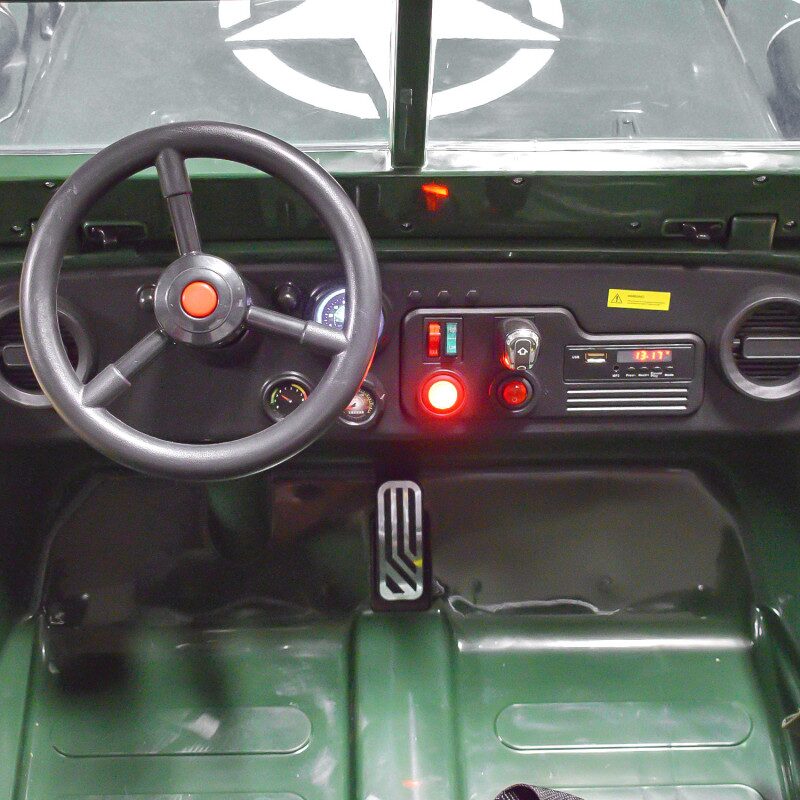 Cette Jeep Willys est conçue pour trois véritables places, un atout rare sur les véhicules électriques enfant. Elle dispose de phares LED, d’une interface audio MP3 avec prise auxiliaire, d’effets sonores pour un réalisme renforcé et de rétroviseurs fonctionnels. La sécurité est assurée par la télécommande parentale 2.4 GHz, permettant de prendre le contrôle à distance à tout moment. La charge maximale recommandée est de 30 kg, idéale pour les enfants de 1 à 5 ans. Disponible en kaki ou jaune, elle offre un style militaire ou aventurier au choix.